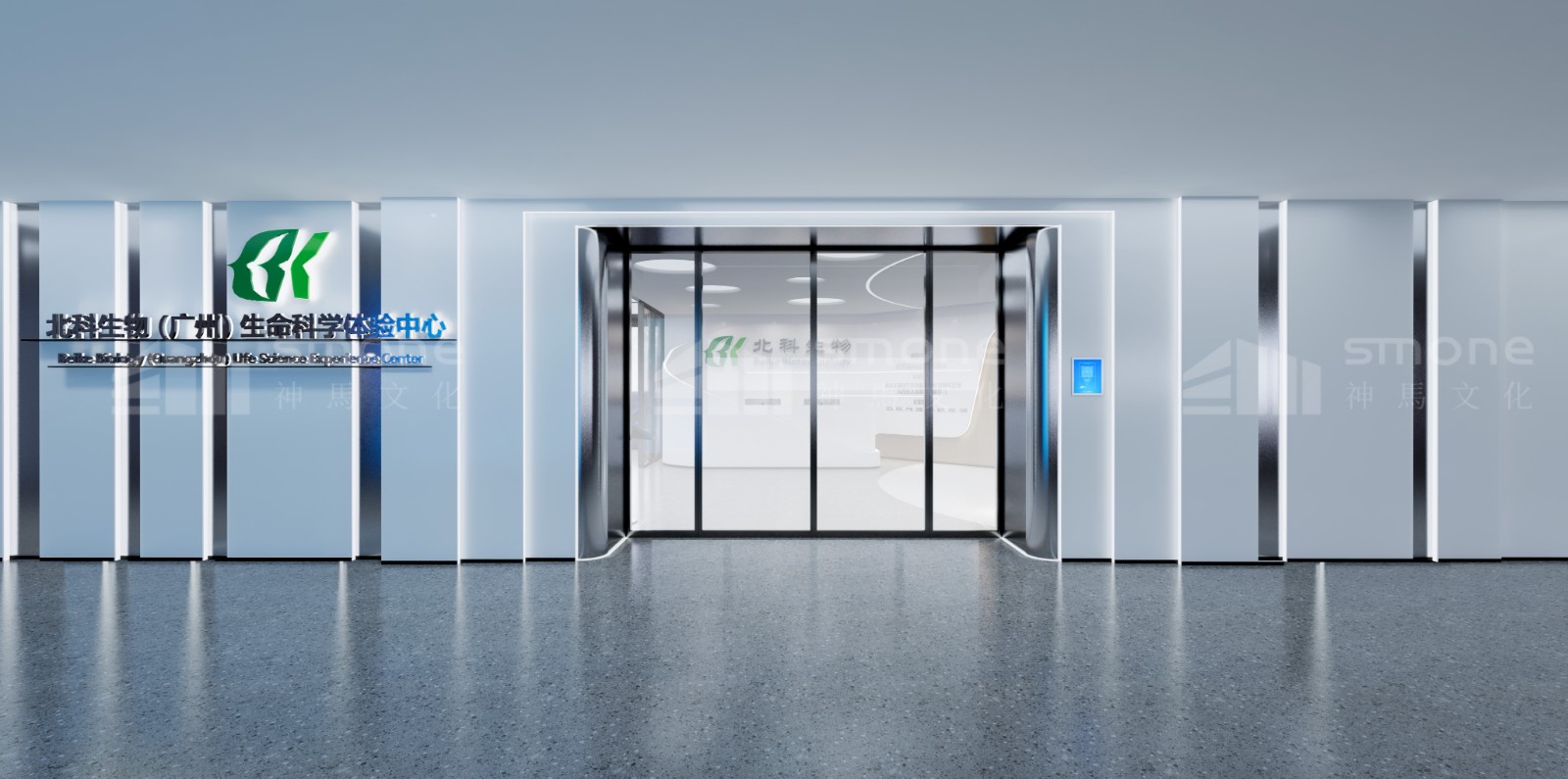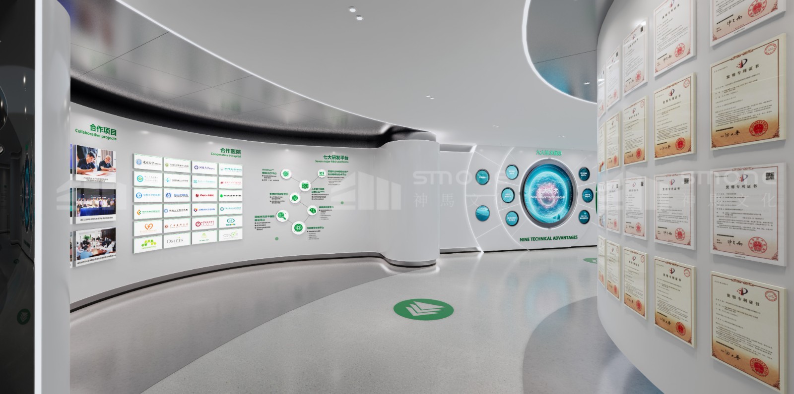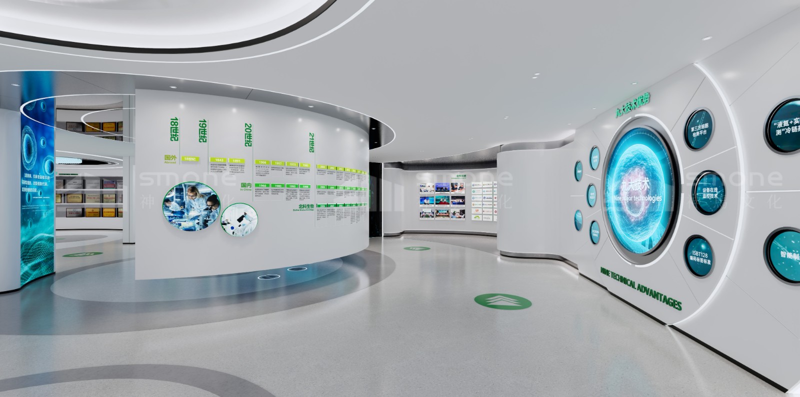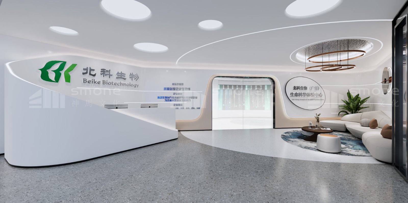 神馬文化通過提取北科生物的企業(yè)LOGO色、行業(yè)色,選擇了科技藍(lán)、未來白、生命綠三種顏色作為整個(gè)展廳的主色調(diào)。以此來打造兼具企業(yè)特色、科技感與健康生命力的展示空間。