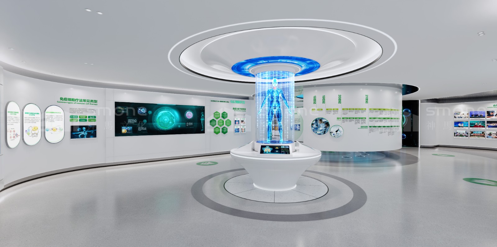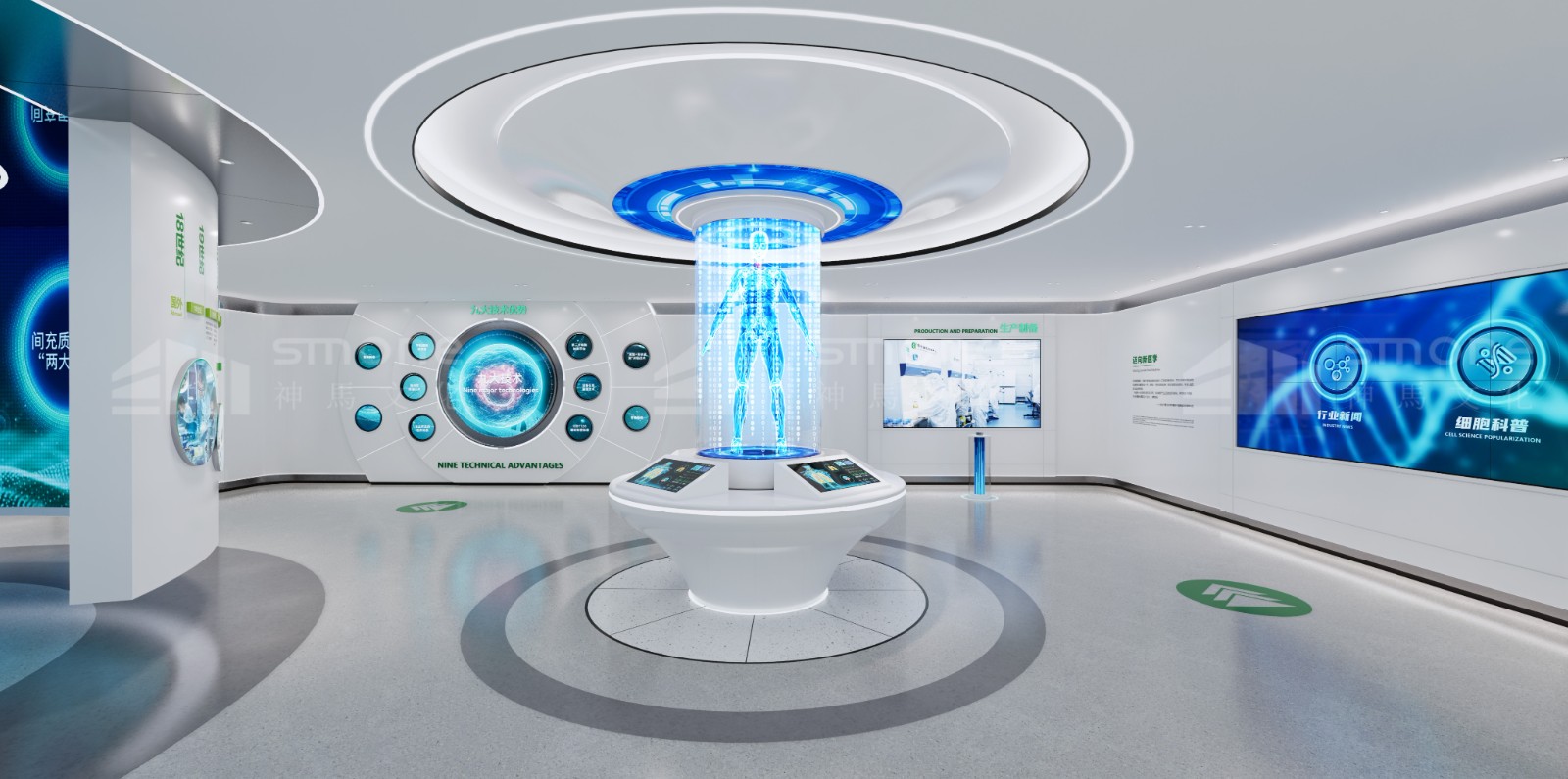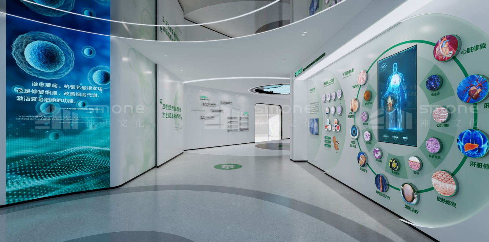 北科生物生命科學(xué)展廳總面積290㎡,為打造出企業(yè)作為細(xì)胞治療時(shí)代的引領(lǐng)者的形象神馬文化以“行業(yè)引領(lǐng),健康筑夢(mèng)”為主題,將空間重塑為探索生命奧秘的智慧殿堂。