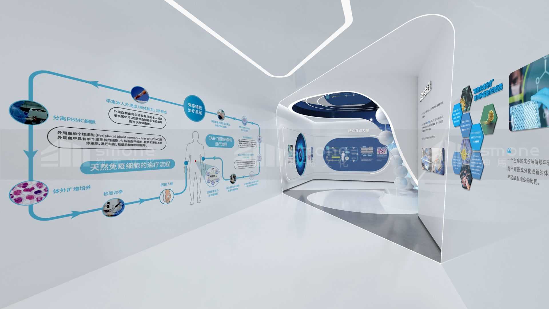 在內(nèi)容的展現(xiàn)形式上,采用了設(shè)計(jì)的干細(xì)胞的創(chuàng)意裝置設(shè)計(jì)和四大多媒體展示裝置,讓訪客從探索生命起源到展望生命未來的游覽路程中,不僅能簡單精準(zhǔn)地了解干細(xì)胞,還能了解廣西先康達(dá)在干細(xì)胞研究上的專業(yè)和實(shí)力。