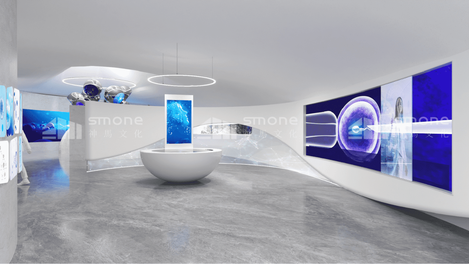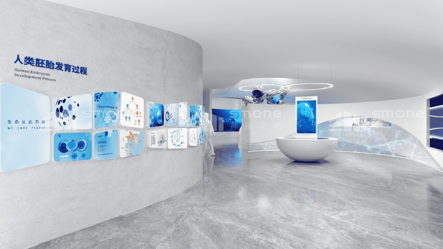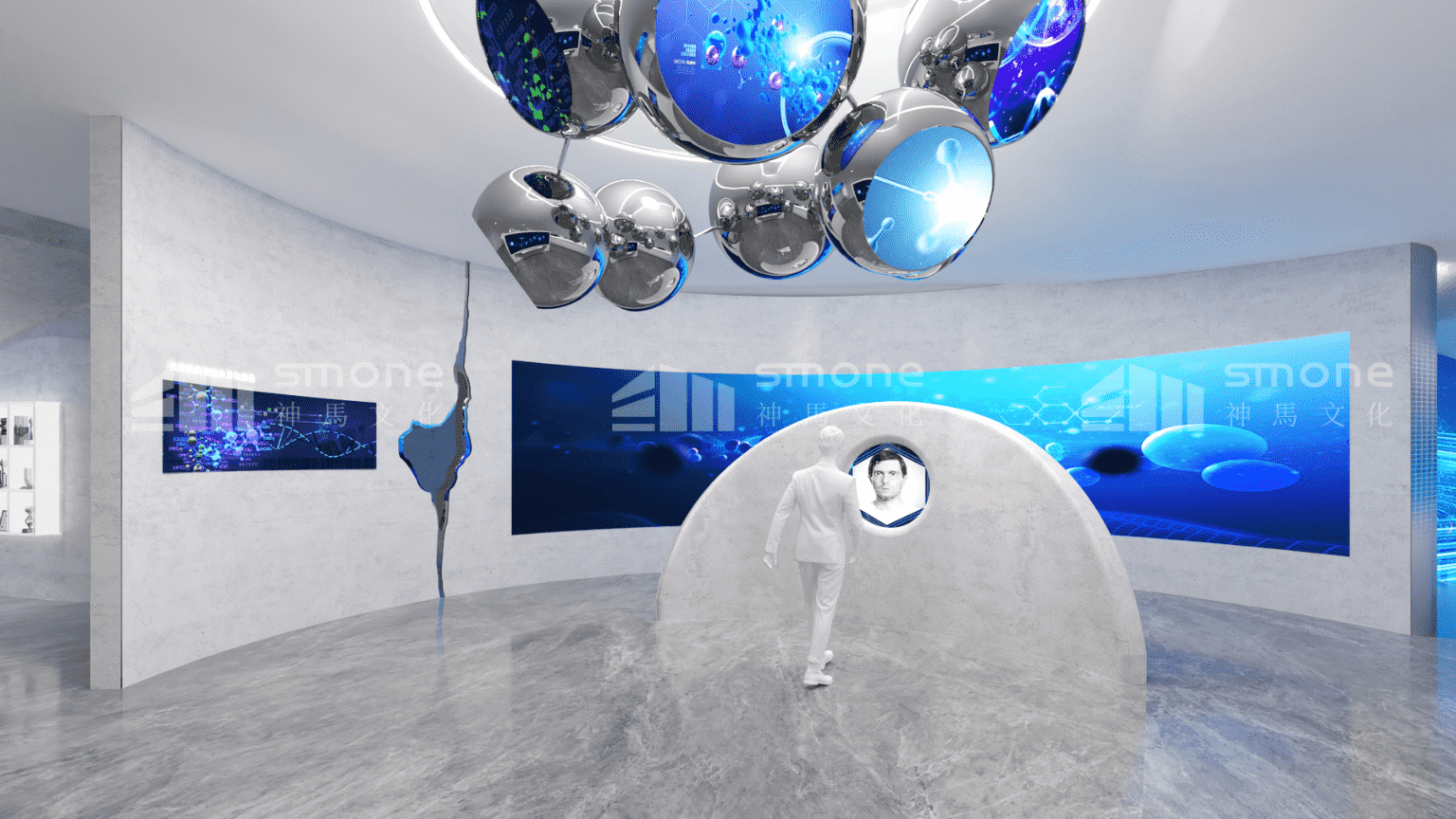 在設(shè)計(jì)上看,建筑與展示空間,一個(gè)是孤云,一個(gè)是明月,二者相輔相成;從內(nèi)容上看,明月幻化成一顆小小的細(xì)胞,帶領(lǐng)著參觀者撥開云霧,展開石藥生命科技館的探索之旅。為了減少對(duì)建筑的承重與結(jié)構(gòu)的影響,整個(gè)展廳在設(shè)計(jì)上,化繁為簡(jiǎn),減少空間硬性分隔,以半開放式的展陳設(shè)計(jì)形式展開空間布置。
