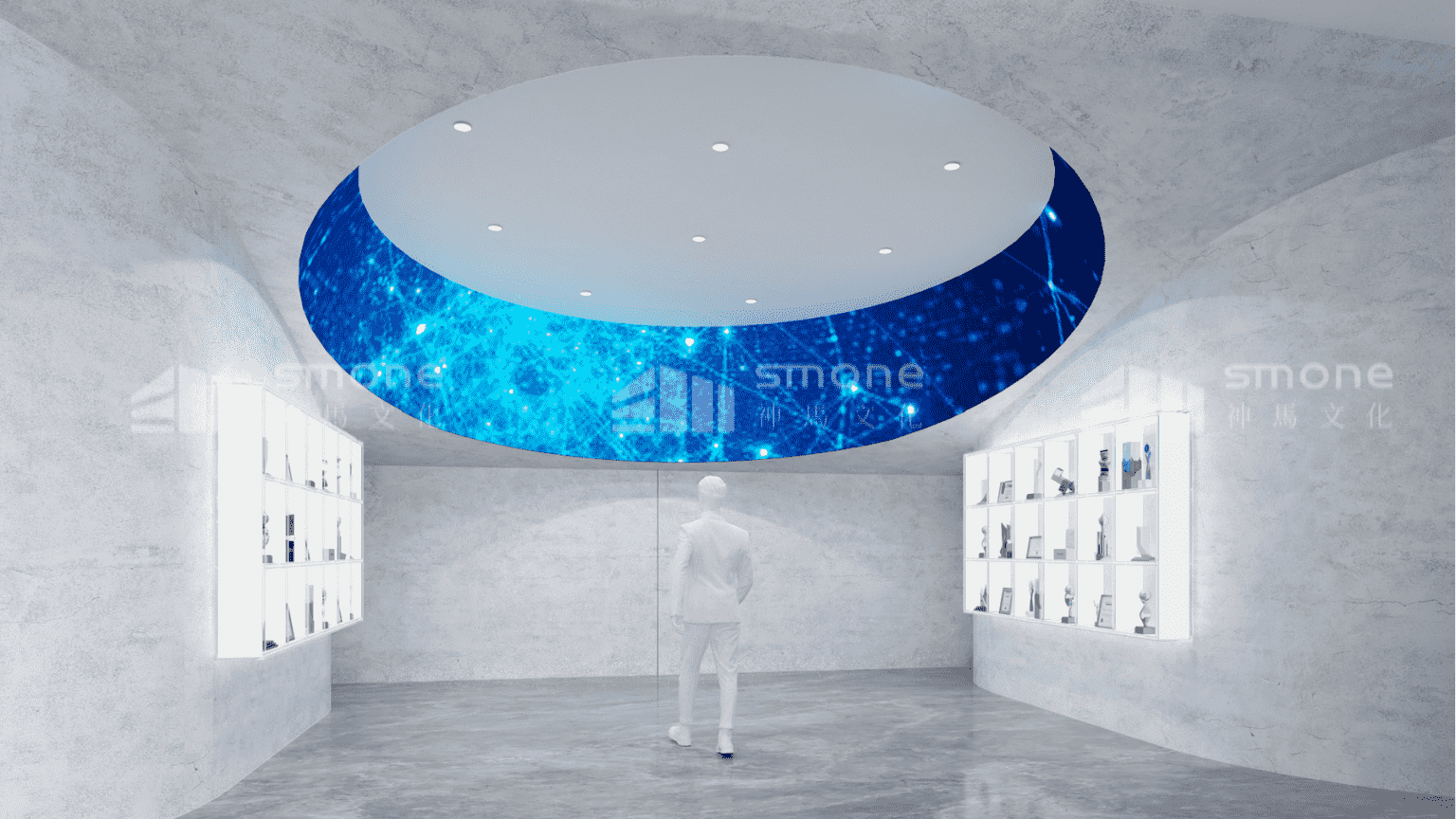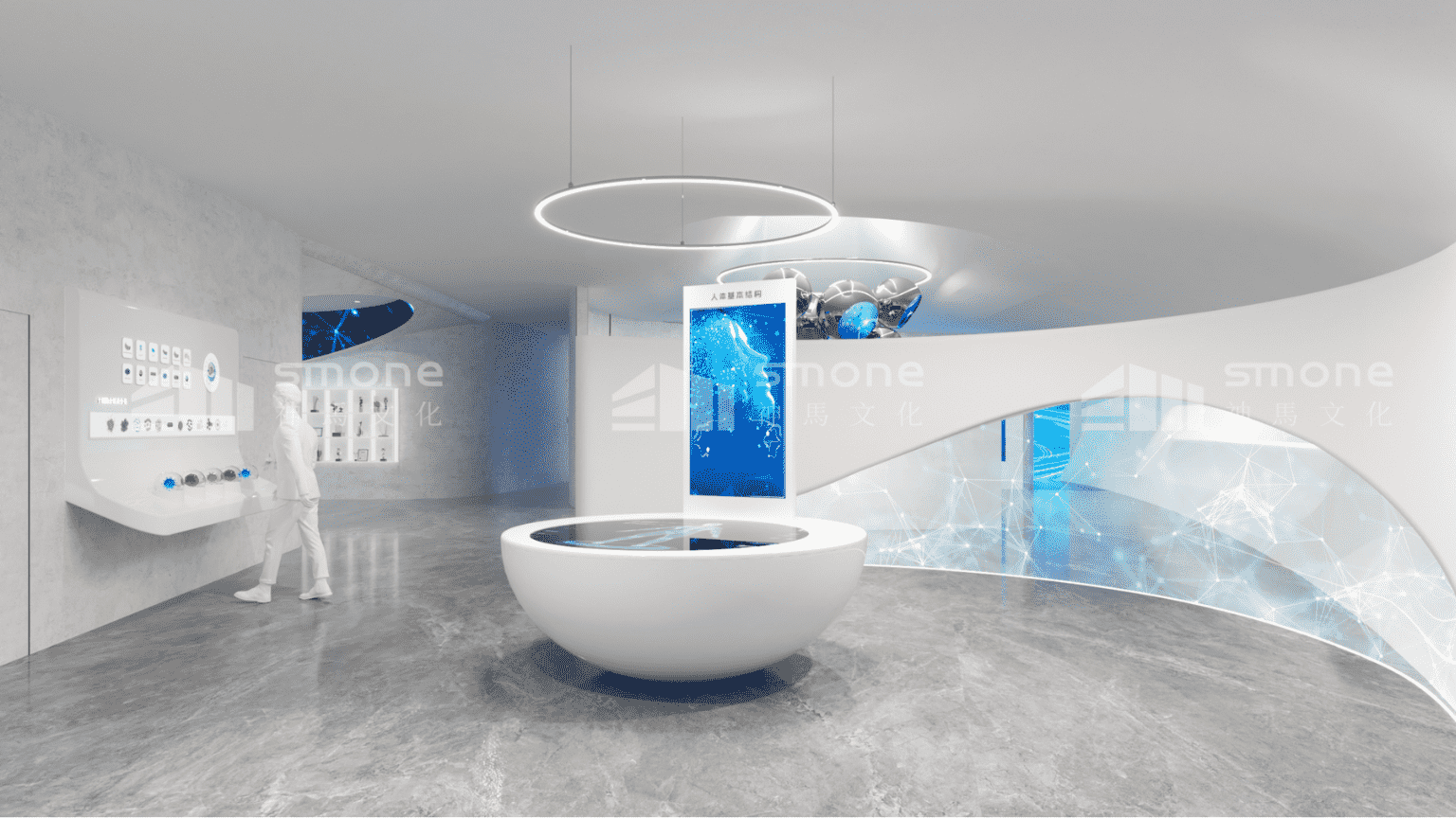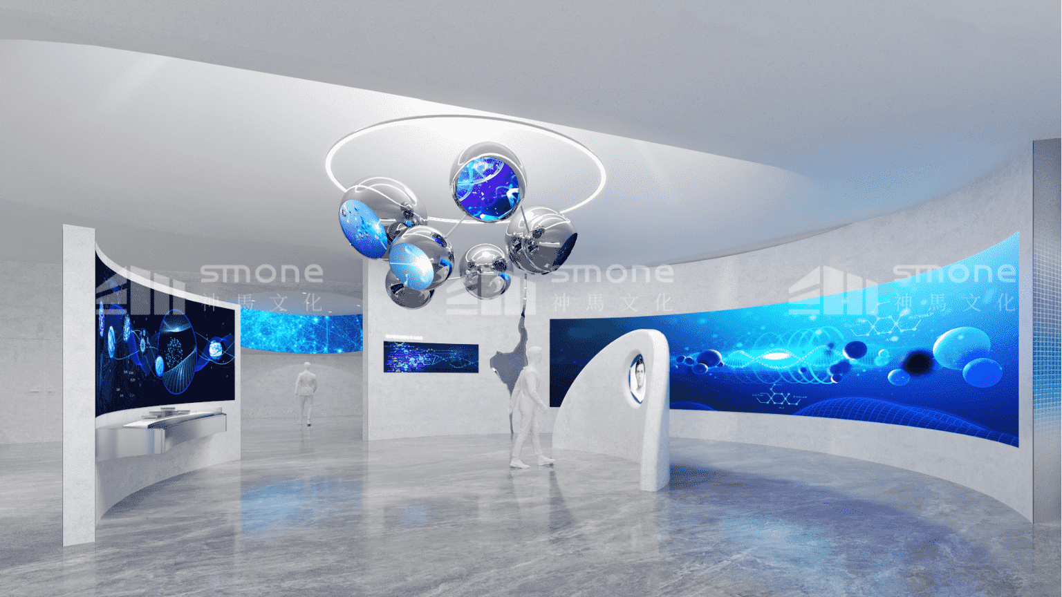 在設(shè)計(jì)上看,建筑與展示空間,一個(gè)是孤云,一個(gè)是明月,二者相輔相成;從內(nèi)容上看,明月幻化成一顆小小的細(xì)胞,帶領(lǐng)著參觀者撥開云霧,展開石藥生命科技館的探索之旅。為了減少對(duì)建筑的承重與結(jié)構(gòu)的影響,整個(gè)展廳在設(shè)計(jì)上,化繁為簡(jiǎn),減少空間硬性分隔,以半開放式的展陳設(shè)計(jì)形式展開空間布置。