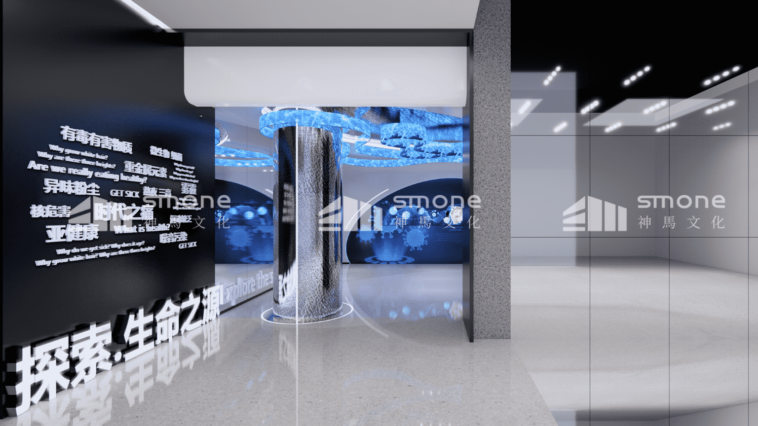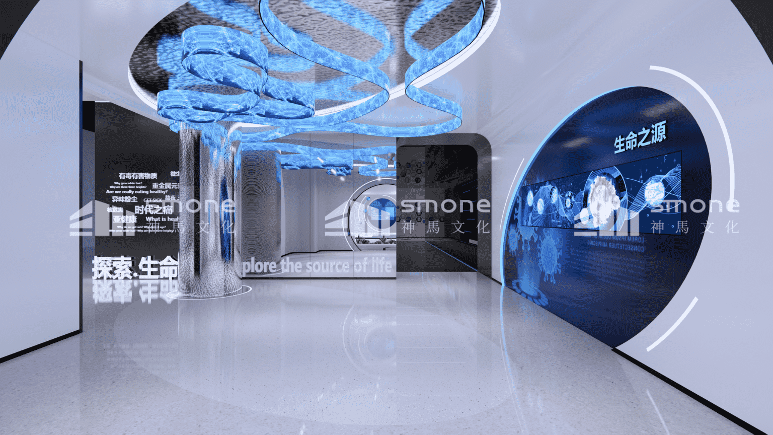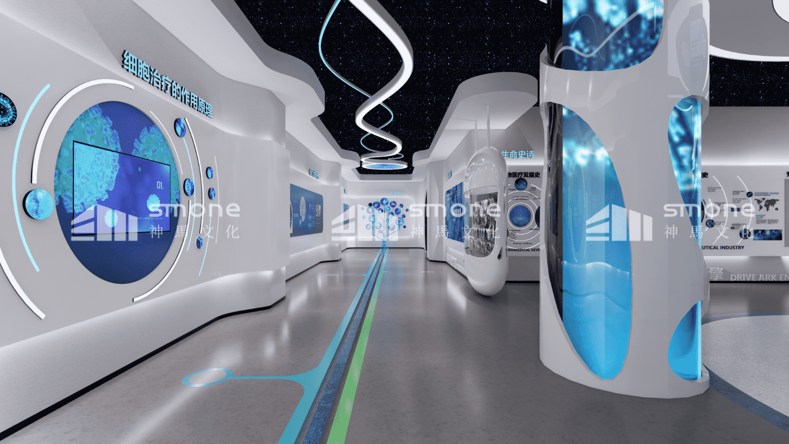 在安可瑞細胞體驗展廳的設計中,神馬文化通過控制燈光色彩和強度,來為不同區(qū)域營造不同的氛圍,讓觀展更加地舒適。 通過沉浸式空間的打造,給觀者帶來身臨其境的感覺。以細胞之門開啟細胞的探索之旅;“星空”里流動感的天花造型帶領觀眾一路游覽至“生命能源補給站”。寓意著細胞技術能源的輸進輸出以及生命的流動。