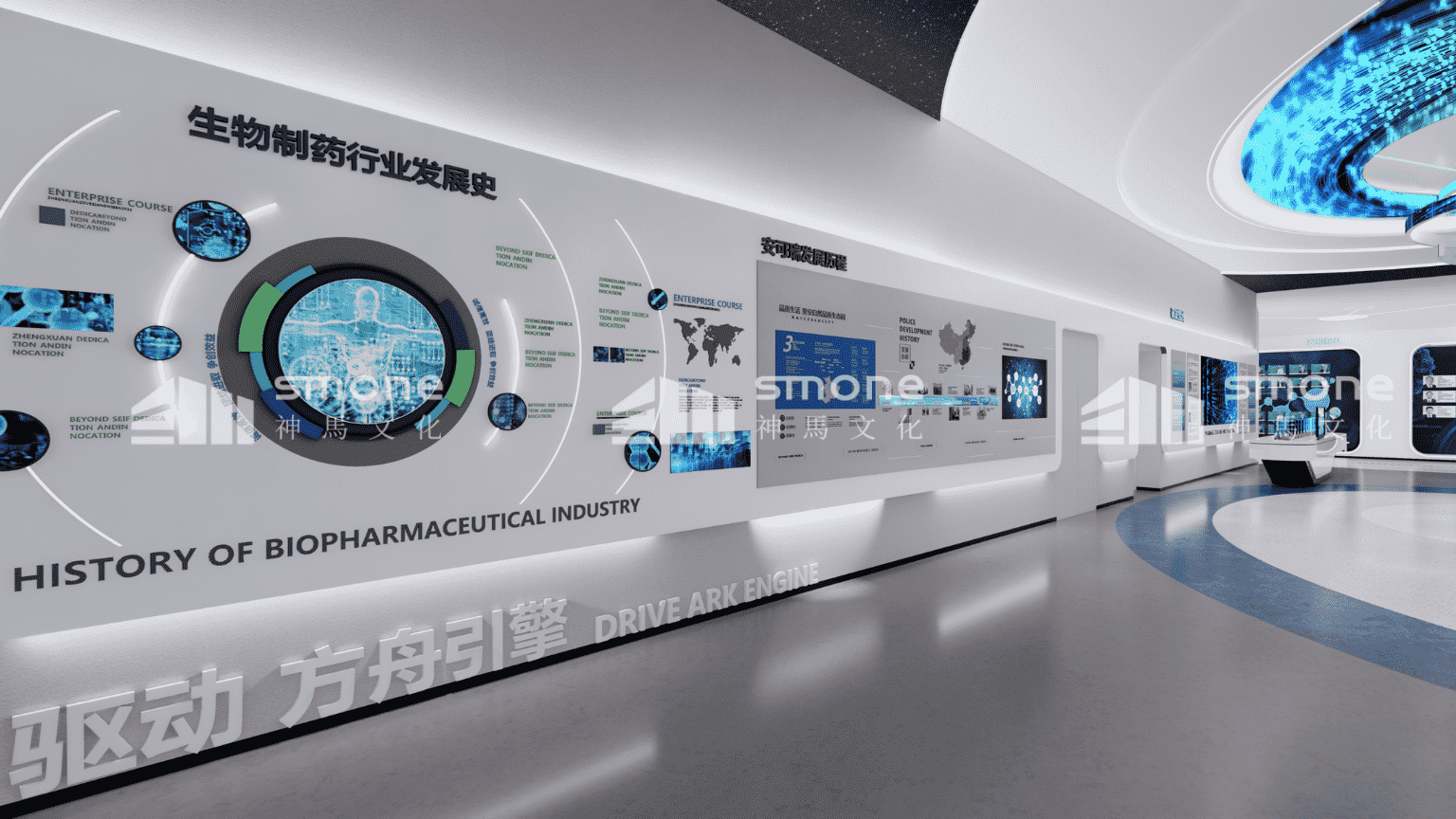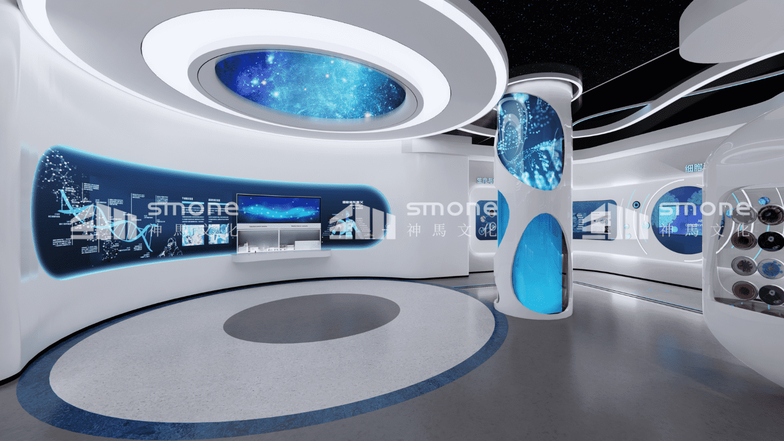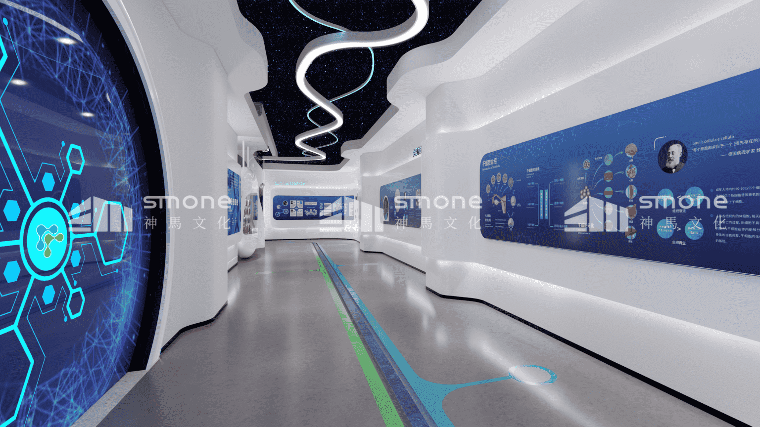 在安可瑞細胞體驗展廳的設計中,神馬文化通過控制燈光色彩和強度,來為不同區(qū)域營造不同的氛圍,讓觀展更加地舒適。 通過沉浸式空間的打造,給觀者帶來身臨其境的感覺。以細胞之門開啟細胞的探索之旅;“星空”里流動感的天花造型帶領觀眾一路游覽至“生命能源補給站”。寓意著細胞技術能源的輸進輸出以及生命的流動。
